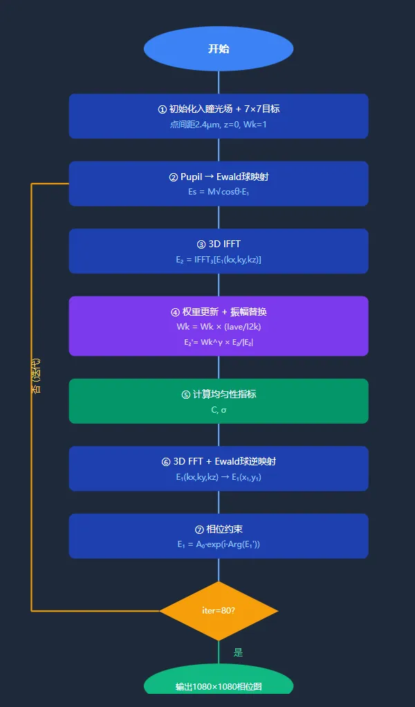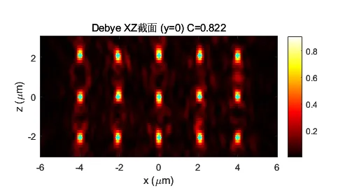 尽管这些算法通过差异化迭代策略(如反馈函数构建和权重更新机制)在特定性能指标(包括光场均匀性、能量利用效率和计算速度)方面展现出各自优势,但其本质均基于二维傅里叶变换原理。关键问题在于,现有设计主要考虑焦平面内的横向光场调制,而忽略了轴向相位调制特性。这种理论局限性使得现有系统仅能生成二维多焦点,从根本上限制了其构建真正三维多焦点的能力。