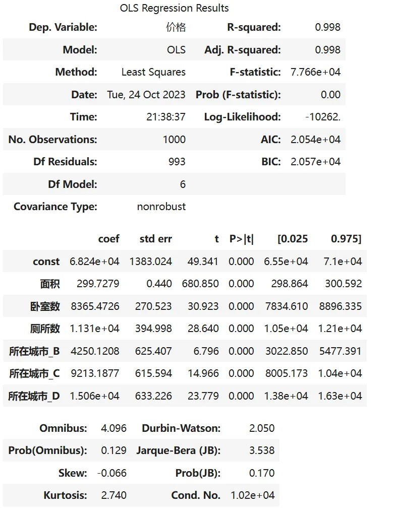 y = data['价格']model = sm.OLS(y, X).fit()print(model.summary())