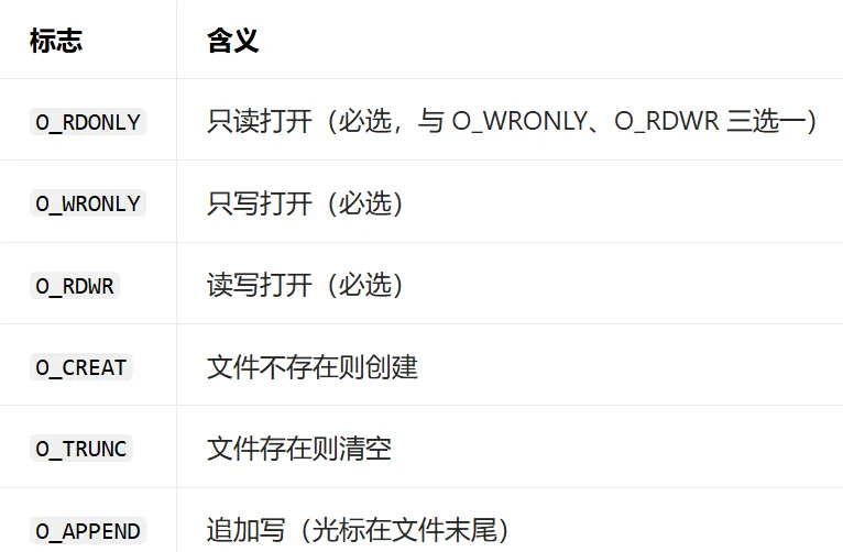 - mode:文件权限(仅创建文件时有效,如0666表示所有者,组,其他用户都有读写权限)