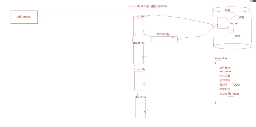 在文件当中,会提供一个文件缓冲区。文件的内容会加载到缓冲区,文件的属性,会用来初始化struct file。