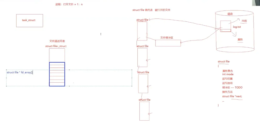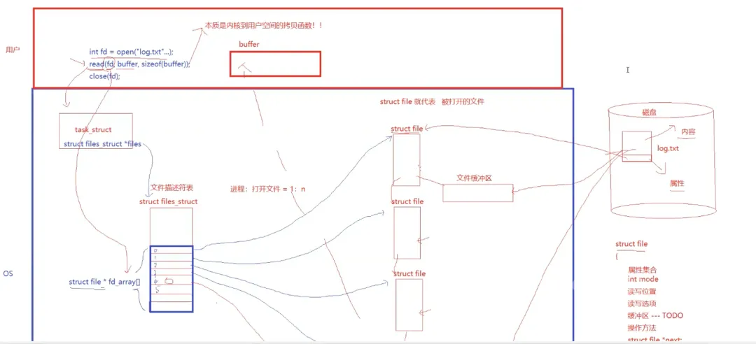 struct file结构体(描述文件属性、缓冲区、读写位置等); - 在进程的文件描述符表(