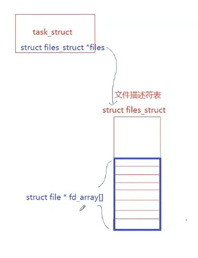 这个叫指针数组,在task_struct里面,会存在一个stuct files_struct*类型的指针,指向这个结构体