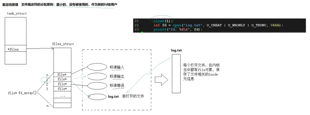 文件描述符的原则:最小的,没有被使用的,作为新的fd给用户