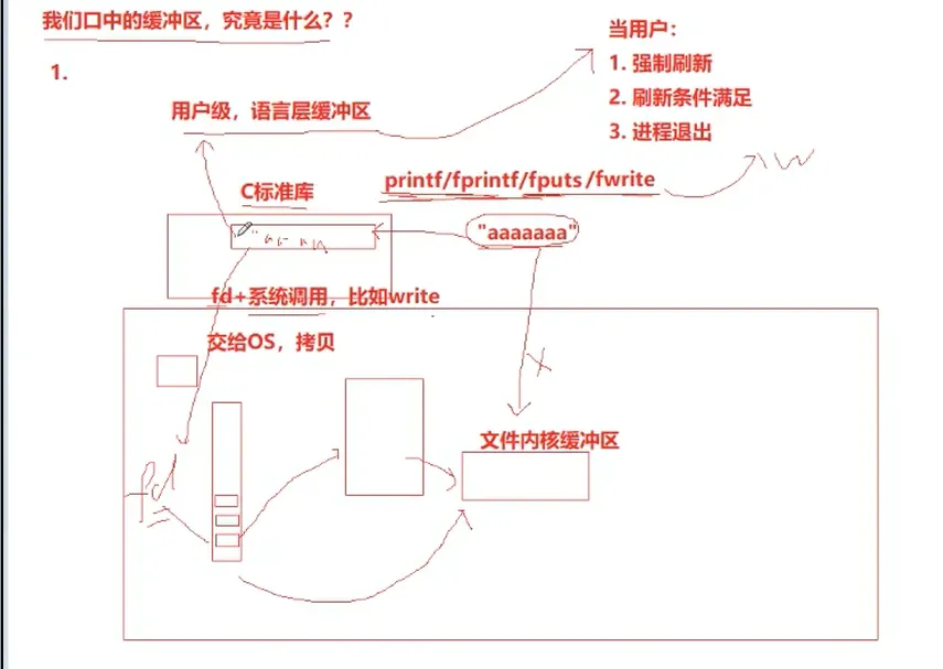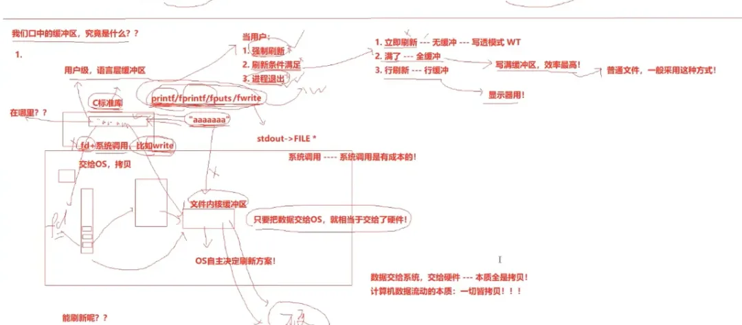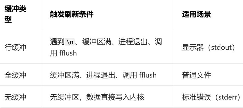 - 重定向会改变缓冲类型:stdout 默认是行缓冲(输出到显示器),若重定向到文件,会变成全缓冲;