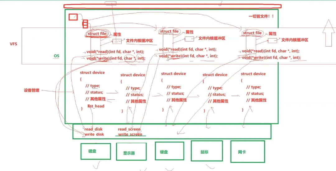 在系统当中,访问任何设备,最终只要提供文件描述符,就不用关心底层用户的差异。直接去使用struct file内部的函数指针,来做对硬件的访问