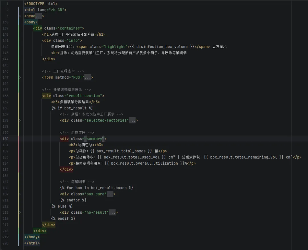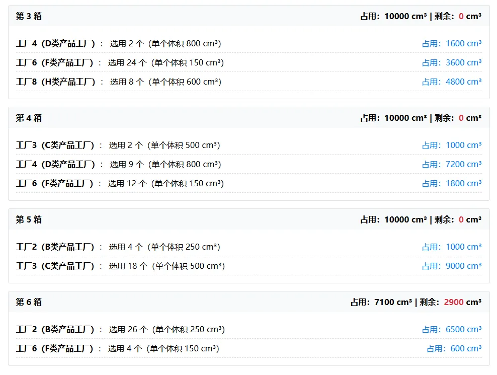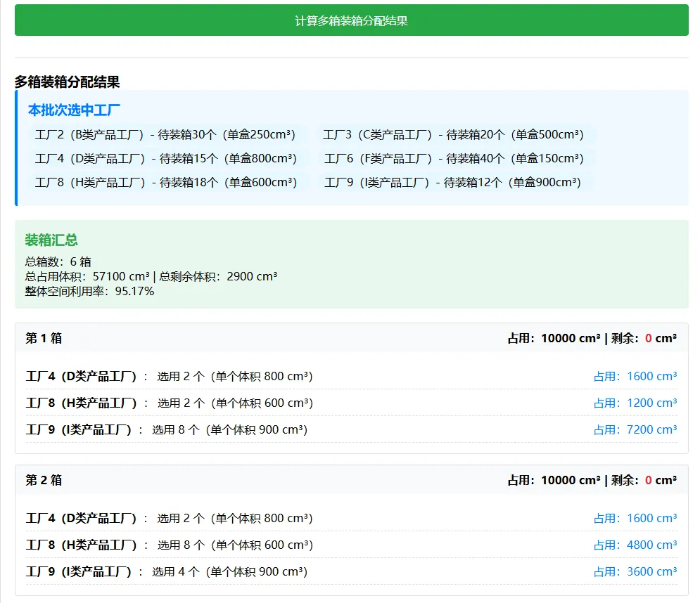 3.界面输出:展示总箱数,以及每箱的详细信息(装了哪些工厂的产品、数量、占用 / 剩余空间)。