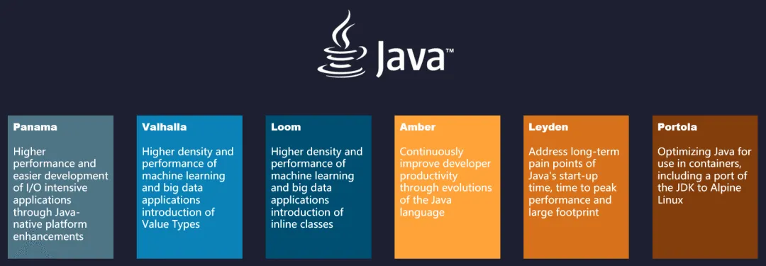 另外值得一提的是Java 16将JDK移植到了Alpine Linux[26]。Alipine Linux[27]是一个非常轻量的Linux发行版,其Docker镜像只有5MB左右(对比Ubuntu系列镜像接近200 MB)。更小的镜像意味着容器环境中更小的磁盘占用和更快的镜像拉取速度,正因如此,Docker 官方已开始推荐使用 Alpine 替代之前的 Ubuntu 作为基础镜像。为了瘦身,Alpine Linux默认是用musl[28]而非传统的glibc作为C标准库,因此之前的JDK并不直接支持Alpine,而是需要在Alpine基础上安装glibc。基于Alpine Linux基础镜像,再结合Java 9引入的模块化能力,如果程序只依赖 java.base模块,Docker镜像的大小可以小至38 MB。激进的团队可能会跳过Java 11,直接从Java 8升级到Java 17,因为这是最新的LTS版本。Java 17(包括最新的Java 18)本身并没有包含太多的性能提升特性,更多的是语法和API的变动,也没啥好列的了。标题的Projext X只是代称,代表了Java官方或社区所推进的一系列项目。这些项目出于不同的动机,但最终的目的都是为了让Java更适应新的时代。完整的项目列表可以看这里[29],其中比较有代表性的有:Project Amber[30]:旨在探索和孵化更小的、以生产力为导向的 Java 语言功能,每个提案的特性都不大,很多已经落地到不同JDK版本中了,像是Records[31]、Sealed Class[32]、Pattern Matching、Text Blocks[33]等等。