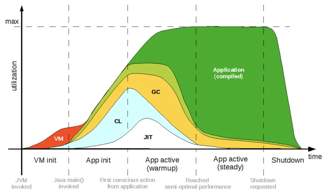 上面这张图能够清晰地看出Java从启动到达到最佳性能的不同阶段。如果跳过字节码,直接将Java代码编译成本地代码,那么所有代码都是在编译期编译和优化好的,是不是就不存在JVM初始化和类加载的开销问题,也不用等预热到JIT编译(编译时还要耗费额外的运行期CPU资源),马上就能达到最大性能?这就是AOT(Ahead-Of-Time Compilation)提前编译的思想。峰值性能:AOT编译不像JIT编译一样能收集程序运行时的信息,因此也无法进行一些更激进的优化,例如基于类层次分析的完全虚方法内联,或者基于程序profile的投机性优化(不过这并非硬性限制,我们可以通过限制运行范围,或者利用上一次运行的程序profile来绕开这些限制)。