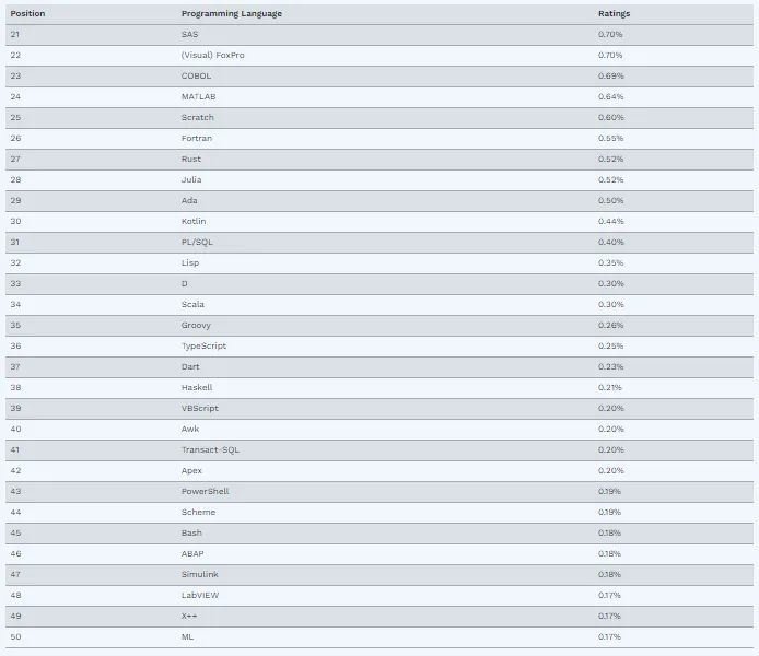 ABC, ActionScript, ATLAS, BBC BASIC, bc, BlitzMax, Bourne shell, CFML, Chapel, CL (OS/400), Clipper, CLIPS, Eiffel, Erlang, EXEC, F#, Forth, Hack, Haxe, Icon, IDL, J#, Ladder Logic, LiveCode, Logo, LPC, Lustre, MDX, MQL4, MUMPS, NATURAL, Nim, Oberon, OCaml, OpenEdge ABL, PostScript, Q, Racket, Raku, REXX, Ring, RPG, Snap!, SPARK, Stata, Tcl, Vala/Genie, VHDL, X10, Xojo