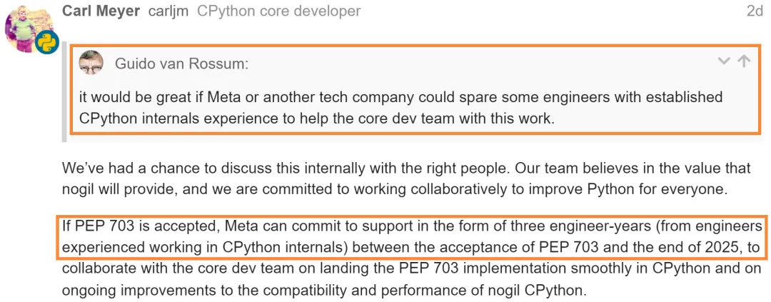 Meta Instagram 团队工程师 Carl Meyer(同时也是 CPython 核心开发者)看到后许下承诺,称如果 PEP 703 提案接受,他们将在 2025 年前投入三个工程师年 (three engineer-years),与核心团队合作去实现 PEP 703。