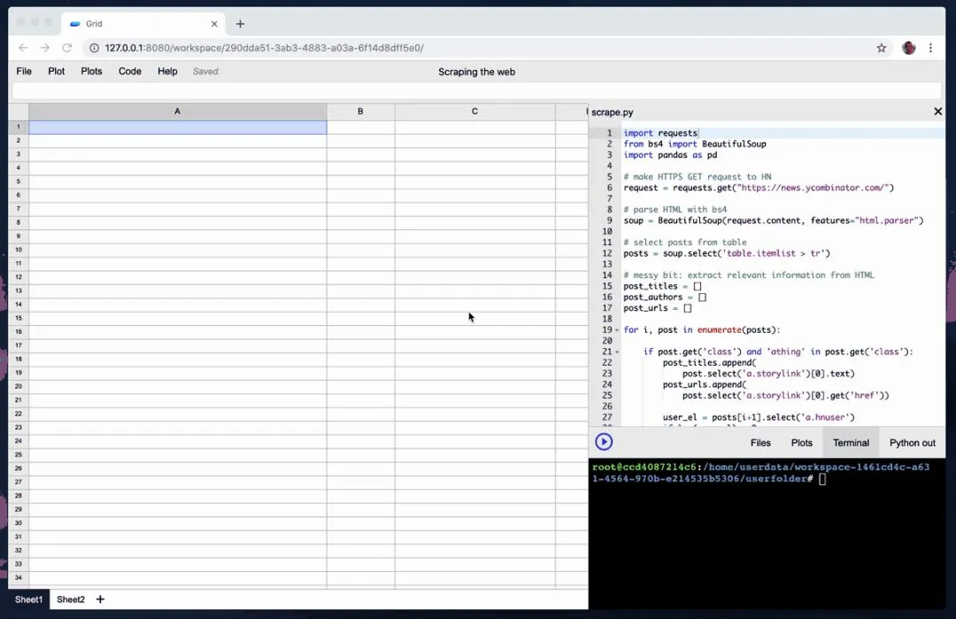 在上面的示例中,一个简短的脚本直接将 Hacker News 网站的文章加载到表格中。