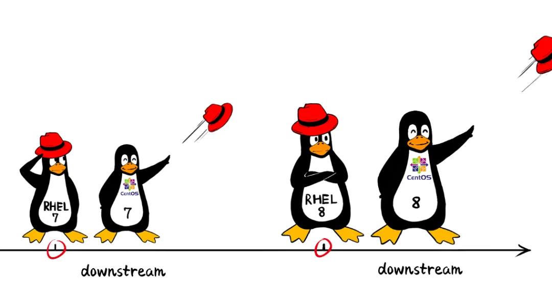 像CentOS这样亦步亦趋,跟在RHEL“屁股”后面发版本的模式,就叫做DownStream,下游模式。选择DownStream的好处,是因为它跟RHEL一毛一样,品质靠强大的RHEL来背书。