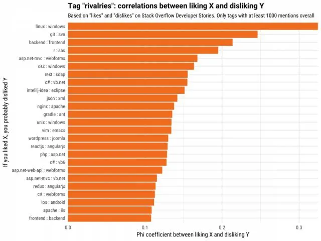 有意思的是,数据还体现了行业中存在的技术型竞争关系,像是 Linux 、OSX vs Windows,Git vs SVN,vim vs emacs ,React vs Angular 等。