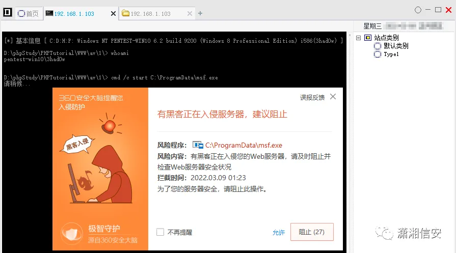 前几天群里有个老哥私聊我问了个问题,phpStudy搭建的Web环境,在已拿到的Webshell中执行命令时被360拦截了,问我该如何绕过?