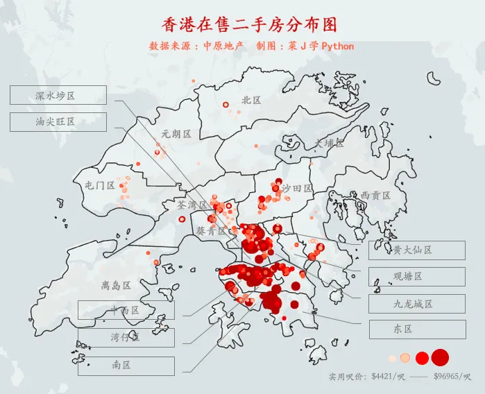香港的贫富差距问题一直十分尖锐,最突出的体现就是收入和楼价的巨大差异。早在60年代末香港房价就经历了暴涨,人们早已对不动产的金融属性了如指掌,全港的投资情绪一直都相当火热。即便香港当前失业率高企,经济环境较差,但购买力仍在,楼市依然坚挺。为了深入了解香港房地产市场,本文用Pyhton采集了香港在售26281套二手房数据并做可视化分析,试图从数据层面理解香港楼市现状。九龙房源最多,港岛价格更高