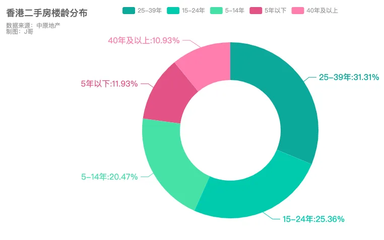 从香港在售二手房楼龄来看,25-39年楼龄的二手房源最多,共7396套,占比31.31%;15-24年5939套,占比25.36%;40年以上房源也有2347套,占比10.93%。50%以上二手房低于1000万