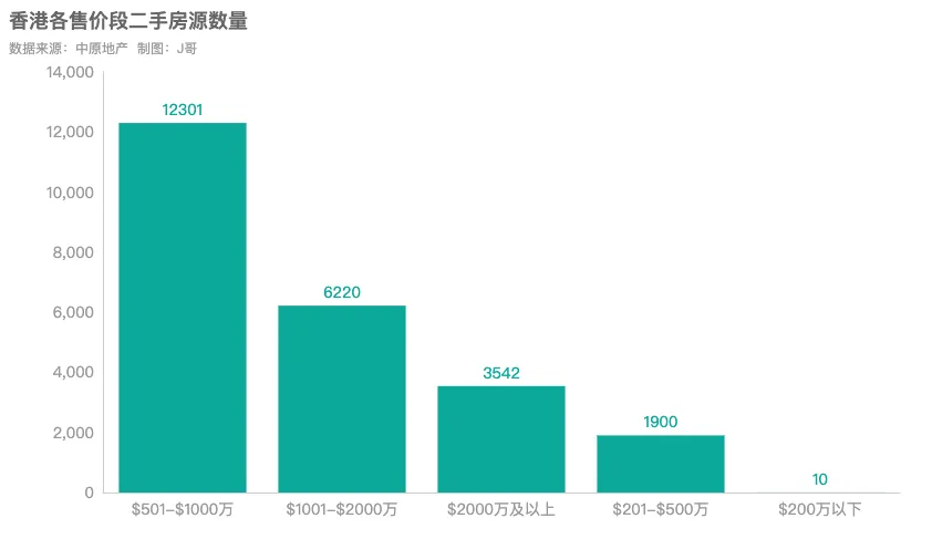 从香港在售二手房售价来看,$501-$1000万(约429-858万人民币)房源数量为12301套,占比51.31%。