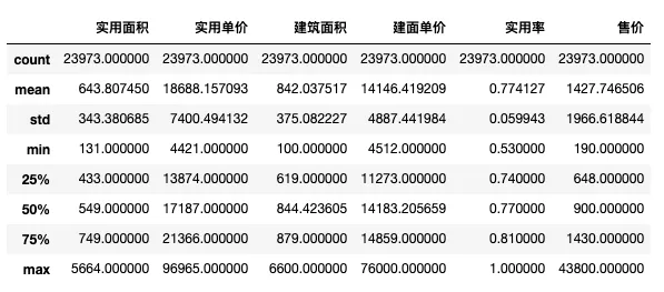 #异常字符替换为空df["建筑面积"] = df["建筑面积"].str.replace(",","").astype("float")df["建面单价"] = df["建面单价"].str.replace("$","").str.replace(",","").str.replace("/呎","").astype("float")#建筑面积和建面单价缺失值用均值填充df = df.fillna(value={'建筑面积':df["建筑面积"].mean(),'建面单价':df["建面单价"].mean()})