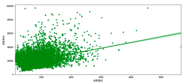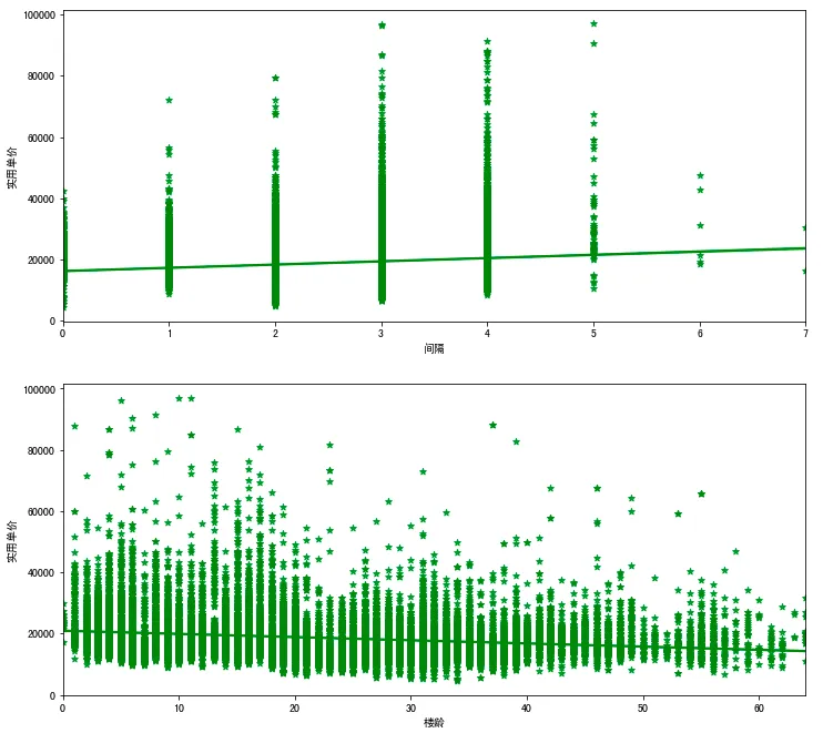 fig,axes=plt.subplots(5,1,figsize=(12,30)) sns.regplot(x='间隔',y='实用单价',data=df1,color='green',marker='*',ax=axes[0])sns.regplot(x='楼龄',y='实用单价',data=df1,color='green',marker='*',ax=axes[1])sns.regplot(x='实用面积',y='实用单价',data=df1,color='green',marker='*',ax=axes[2])sns.regplot(x='建筑面积',y='实用单价',data=df1,color='green',marker='*',ax=axes[3])sns.regplot(x='实用率',y='实用单价',data=df1,color='green',marker='*',ax=axes[4])