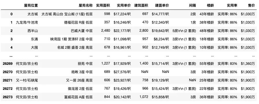 从相关系数表和回归图来看,间隔(即居室)和楼龄都与香港二手房房价无明显的相关性。实用面积与房价具有较强的正相关性,一般来说,人们在看房子时看到的面积是建筑面积,但却不是实用面积。套内建筑面积=套内使用面积+套内墙体面积+阳台面积,而实用面积就是套内使用面积。另外,实用率与房价也无相关性,这与大部分人的感性认识存在偏差。本文数据来源于中原地产,网页结构相对简单。数据清洗主要用到Python的pandas库,由于内容较多,仅提供核心字段清洗代码。数据可视化主要用到Python的pyecharts库,都是一些基础图表,本公众号往期原创文章也已多次提及。爬虫核心代码