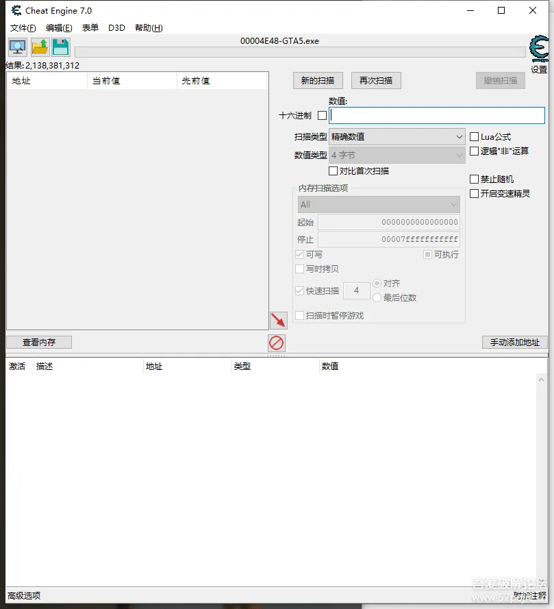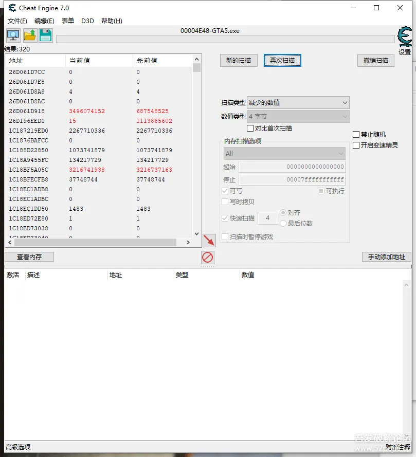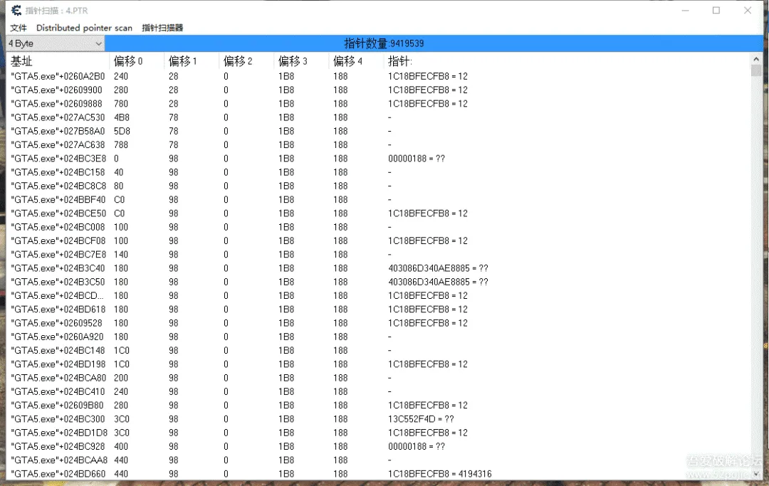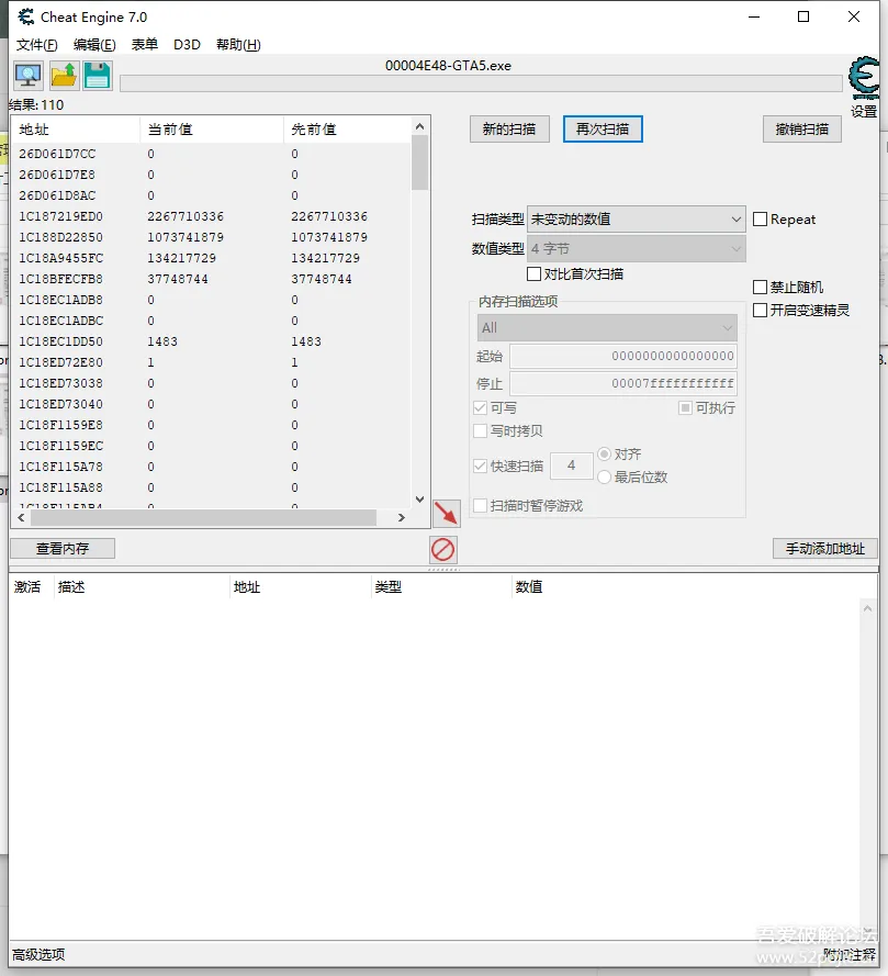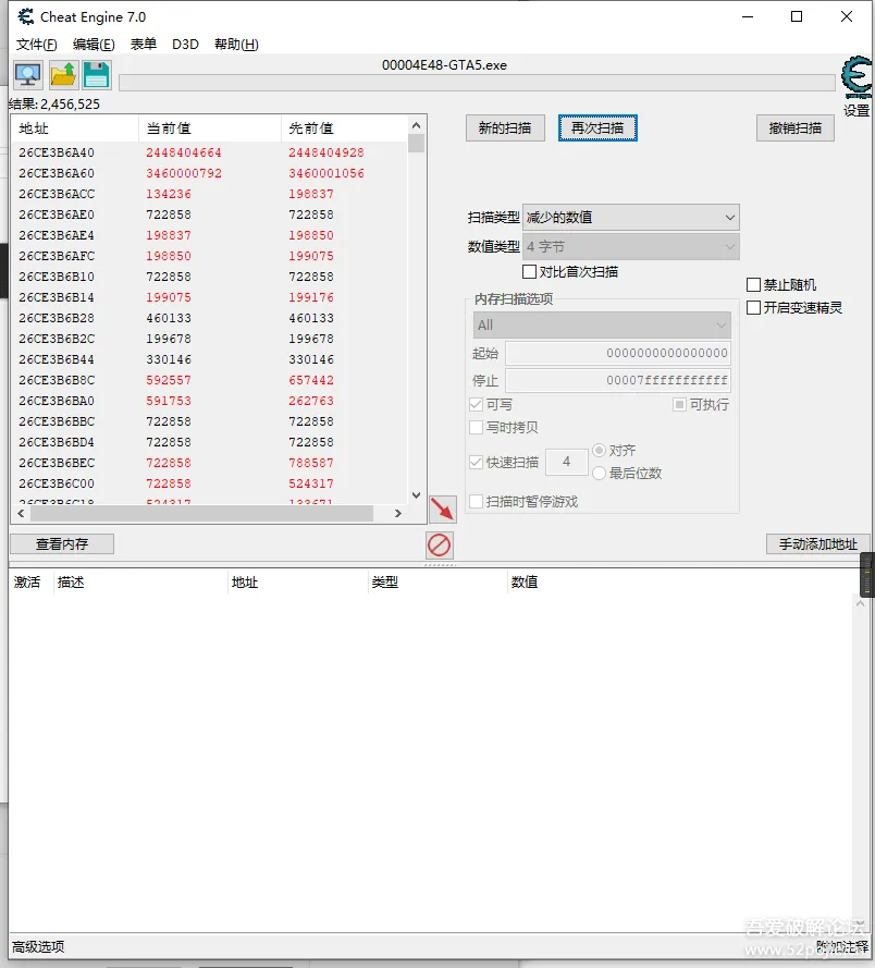 步骤循环,等结果少于5000的时候。就可以通过搜索未变动的数值,来开始查找最终的基址。