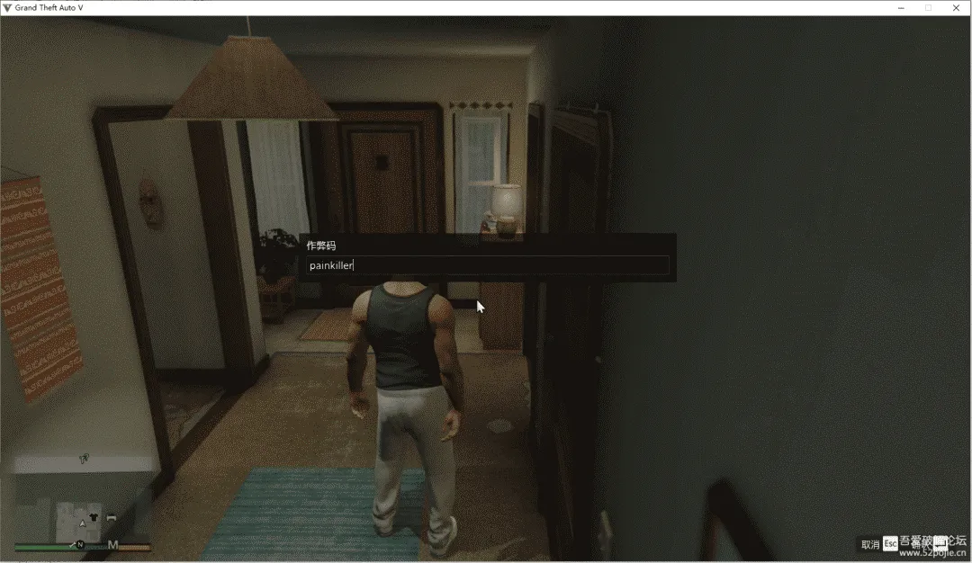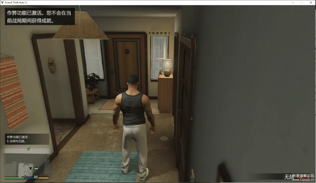 打开GTAV,进入故事模式。GTAV官方在故事模式中,有给出作弊代码,其中有一个无敌五分钟的命令。从这个命令入手,查找他的基址,没准能用。