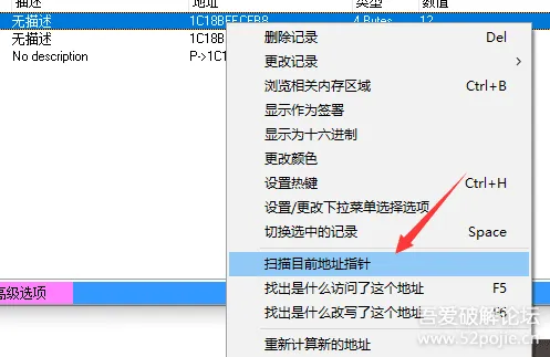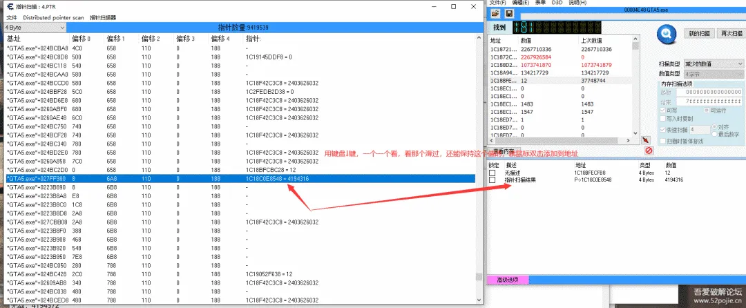 一定要选多几个,因为进入线上模式时候,值会变,有的会变成?号,有的是不知道啥值,所以要选多几个加以观察,或者不关闭指针扫描结果窗口。