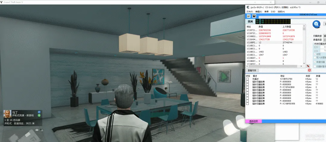 GTA = 0x7FF79B5D0000#GTA.EXE的基址,原本是打算通过模块名字获取的,但是不知道为什么返回-1.可能是64位游戏,涉及到一些权限问题,后面在研究一下,目前主要是为了达到目的。