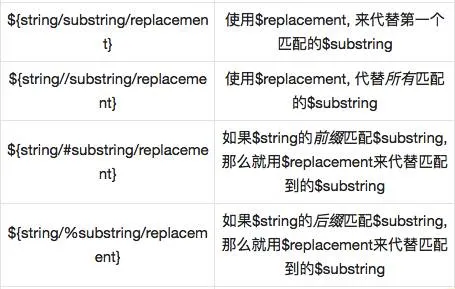 ${变量/查找/替换值} 一个“/”表示替换第一个,”//”表示替换所有,当查找中出现了:”/”请加转义符”\/”表示。