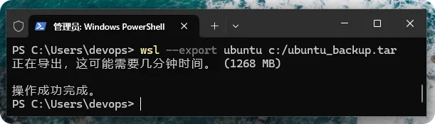 导出 Linux 发行版就是导出成预设 .tar 扩展名的分发文件,换句话说,就是备份目前的 Linux 发行版,例如:我们准备将预设 Linux 发行版 Ubuntu 导出成 C:\Ubuntu_Backup.tar 的分发文件,使用的是 --export 选项,如下所示:> wsl --export Ubuntu C:\Ubuntu_Backup.tar