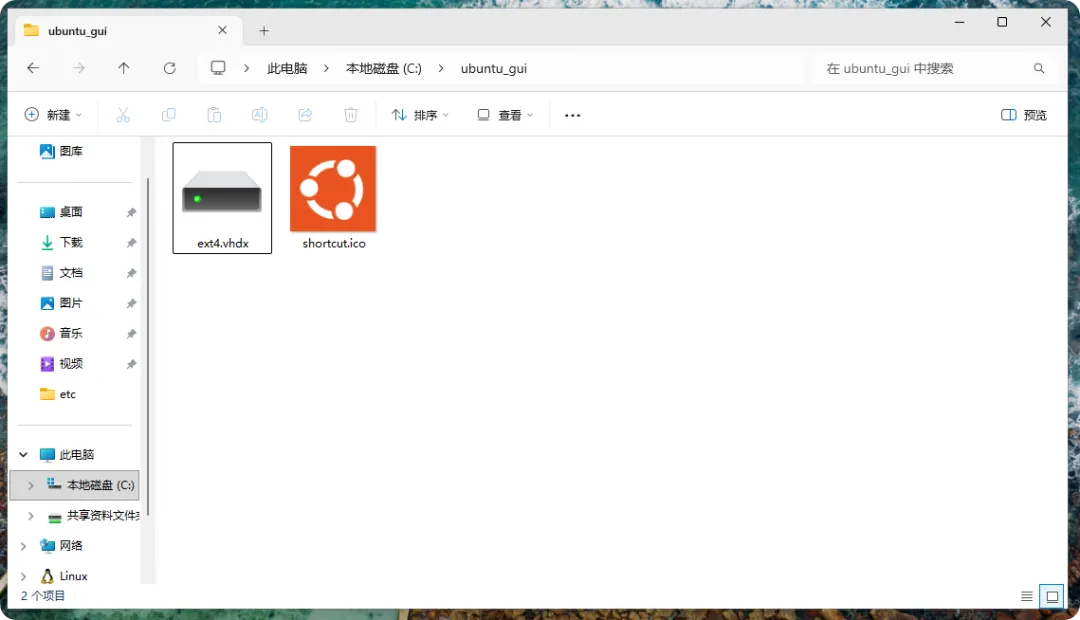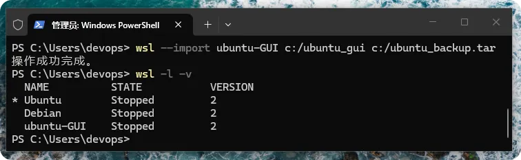 上述导入操作需要一些时间,在完成操作后,可以执行 wsl -l -v 命令显示成功导入名为 Ubuntu-GUI 的 Linux 发行版。在「C:\Ubuntu_GUI」目录就是此发行版虚拟硬盘 .vhdx 的文件系统,如下图所示:在 WSL 2 启动导入的 Linux 发行版 Ubuntu-GUI 需指明名称和用户,如下所示:> wsl -d Ubuntu-GUI -u devops