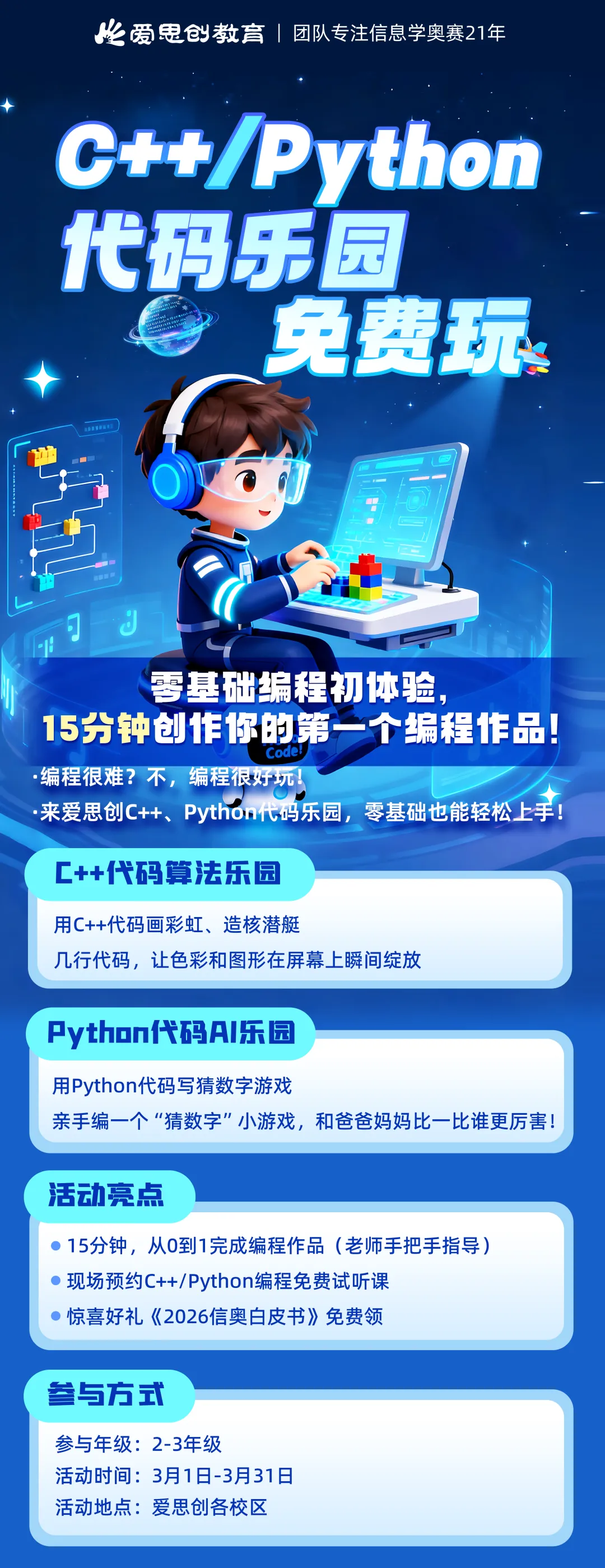 这个3月,爱思创C++、Python代码乐园正式启幕,免费开放体验,让零基础的孩子在15分钟内,亲手解锁编程的乐趣,完成属于自己的第一个编程作品,开启一段充满惊喜的科技启蒙之旅!