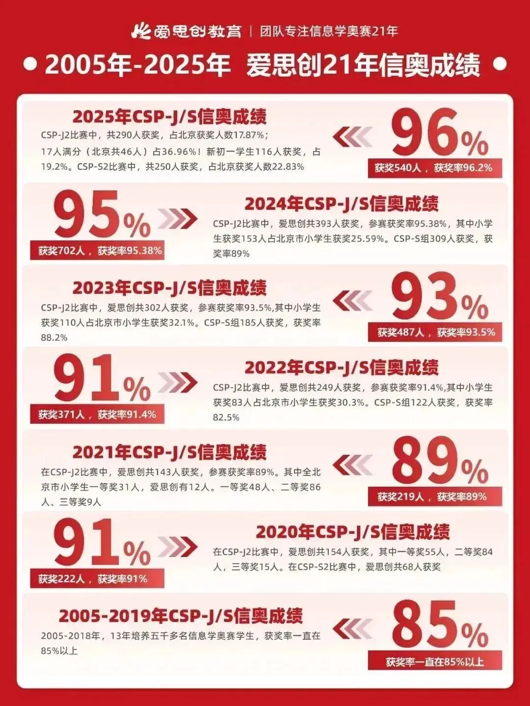 2023-2025年,爱思创CSP-J组总获奖人数985人,CSP-S组总获奖人数744人。
