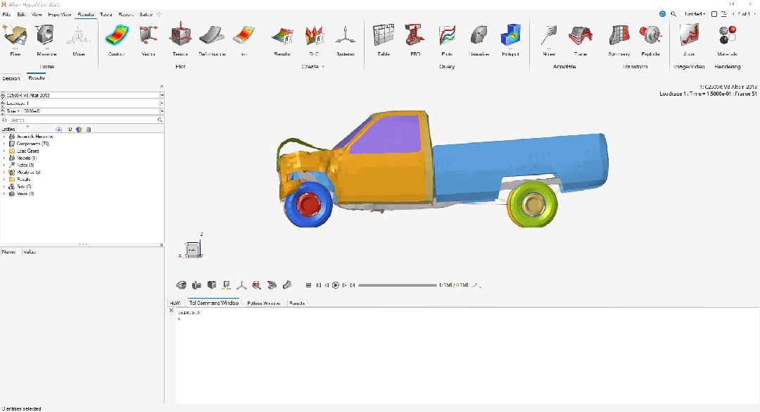 # 定义位移云图函数,datacomponent可选值为 "Mag" "X" "Y" "Z" # usetracking 是否使用局部坐标系, "False" 不使用局部坐标系 ,"True"使用局部坐标系def counter_displacement (datacomponent,usetracking = "False"): import hw import hw.hv as hv ses = hw.Session() page = ses.get(hw.Page) win = ses.get(hw.Window)# 获取云图object res = ses.get(hv.Result)# 设置云图类型 rescounter = hv.ResultDefinitionScalar(dataType="Displacement", dataComponent=datacomponent,)# 设置是否使用局部坐标系if usetracking == "True": rescounter.useTracking = Trueprint("use tracking") res.plot(rescounter)# 此处只是示例python 读取云图方法# 实际应用中hv.ResultDefinitionScalar(dataType="stress",dataComponent="vonMises", layer="Max")# datatype,datacomponent,layer 可设置为函数的参数def counter_vonMises (): import hw import hw.hv as hv ses = hw.Session() page = ses.get(hw.Page) win = ses.get(hw.Window)# 获取云图object res = ses.get(hv.Result)# 设置云图类型 rescounter = hv.ResultDefinitionScalar(dataType="stress",dataComponent="vonMises", layer="Max")# 通过collection 选择需要读取云图的零件 此处通过id选择# 此处读取两个件 多个件可通过for循环 加入collection中# col = hv.Collection(hv.Part,populate=False)# col.addByID(hv.Part,2400013)# col.addByID(hv.Part,2400011)# rescounter.collection = col# 上面四句命令可以省略,默认读取整个模型的云图 res.plot(rescounter)# 设置counter legend# 获取legend object leg = hv.LegendScalar()# 设置legend level (有几种颜色层级) leg.numberOfLevels = 3# 设置数值格式 (auto, fixed, engineering and scientific.) leg.numericFormat = "fixed"# 设置数值精度 例如保留两位小数 leg.numericPrecision = 2# 设置颜色通过rgb (level index,color) leg.setLevelColor(3,(250,0,0))# 设置颜色通过颜色名 (level index,color) leg.setLevelColor(2,"blue")# 设置颜色通过hv里面颜色id 8代表灰色 (level index,color) leg.setLevelColor(1,8)# 设置云图数值 leg.setLevelValue(1,2) leg.setLevelValue(2,5)# 设置云图 阈值 leg.thresholdMax = True leg.thresholdMaxValue = 350def create_tracking_systems (): import hw import hw.hv as hv ses = hw.Session() page = ses.get(hw.Page) win = ses.get(hw.Window) model = ses.get(hv.Model) hw.evalHWC('tracking create "Tracking System 1"') hw.evalHWC('tracking "Tracking System 1" node 24031454') hw.evalHWC('tracking makecurrent "Tracking System 1"')