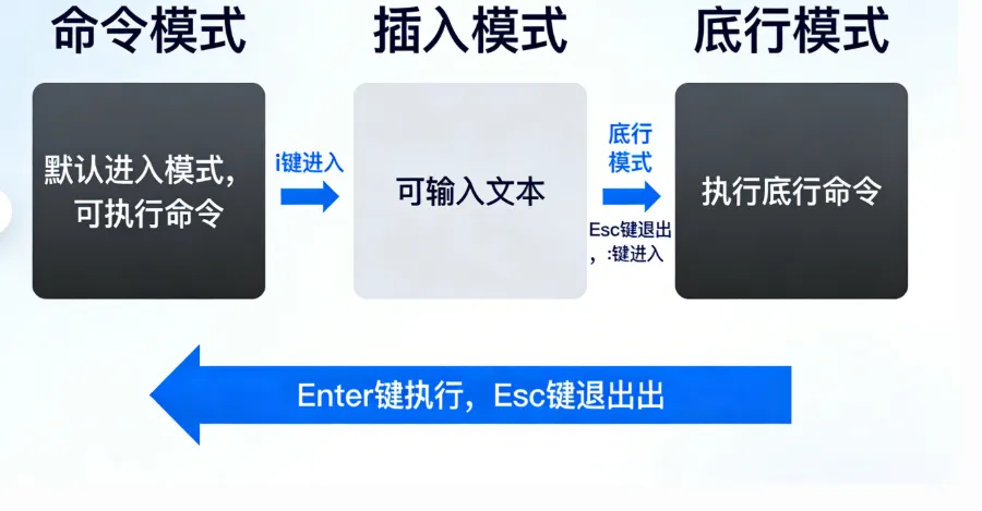 如果在输入模式按esc就会进入命令模式,在命令模式输入:则会进入底行模式 具体我们可以参考下面这张图,