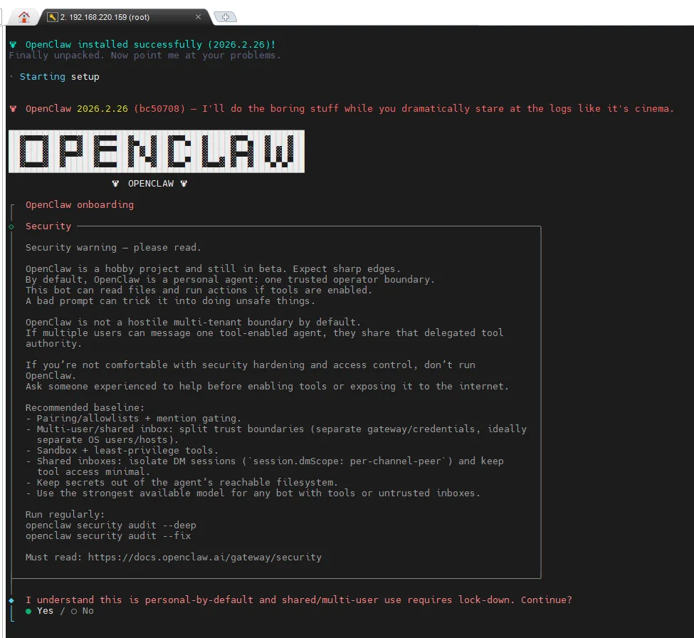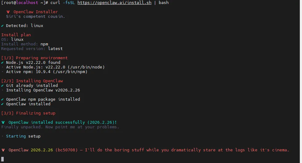 [root@localhost ~]# curl -fsSL https://openclaw.ai/install.sh | bash