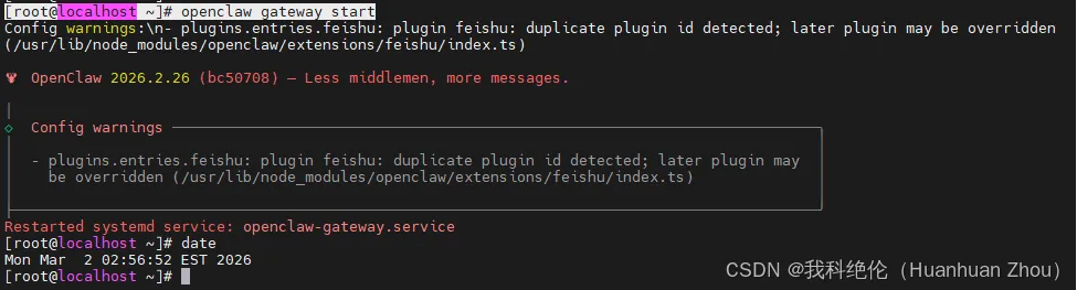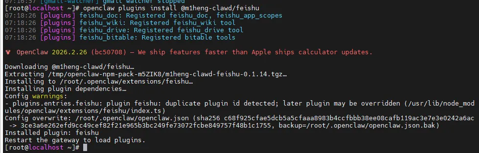 [root@localhost ~]# openclaw plugins install @m1heng-clawd/feishu