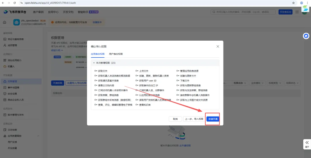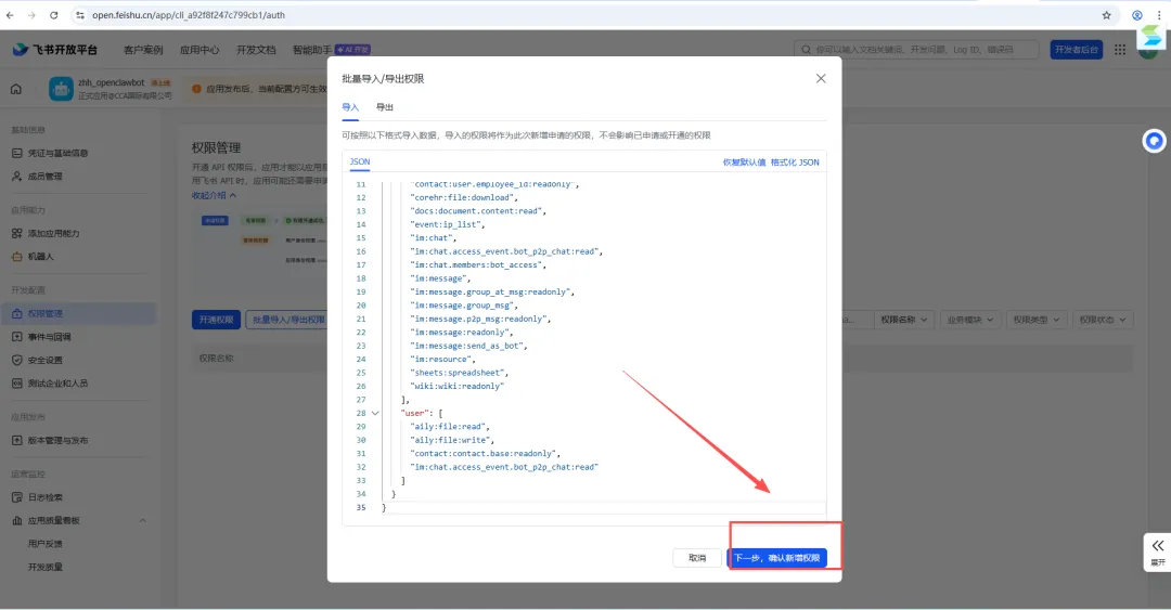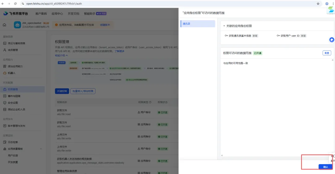 {"scopes": {"tenant": ["aily:file:read","aily:file:write","application:application.app_message_stats.overview:readonly","application:application:self_manage","application:bot.menu:write","cardkit:card:write","contact:contact.base:readonly","contact:user.employee_id:readonly","contact:user.base:readonly","corehr:file:download","docs:document.content:read","event:ip_list","im:chat","im:chat.access_event.bot_p2p_chat:read","im:chat.members:bot_access","im:message","im:message.group_at_msg:readonly","im:message.group_msg","im:message.p2p_msg:readonly","im:message:readonly","im:message:send_as_bot","im:resource","sheets:spreadsheet","wiki:wiki:readonly" ],"user": ["aily:file:read","aily:file:write","contact:contact.base:readonly","im:chat.access_event.bot_p2p_chat:read" ] }}