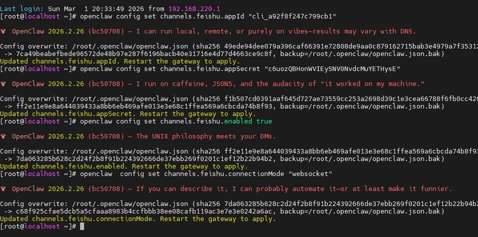 # 设置App IDopenclaw config set channels.feishu.appId "cli_a92f8f247c799cb1"# 设置App Secretopenclaw config set channels.feishu.appSecret "c6uozQBHonWVIEySNV0NvdcMuYETHysE"# 启用飞书通道openclaw config set channels.feishu.enabled true# 使用websocket连接模式openclaw config set channels.feishu.connectionMode "websocket"# 单聊策略:需配对clawdbot config set channels.feishu.dmPolicy pairing# 群聊策略:白名单clawdbot config set channels.feishu.groupPolicy allowlist# 需@机器人才能触发响应clawdbot config set channels.feishu.requireMention true