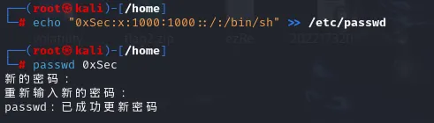 echo "0xSec:x:1000:1000::/:/bin/sh" >> /etc/passwd #增加普通用户账号passwd 0xSec #修改0xSec的密码为123456