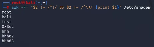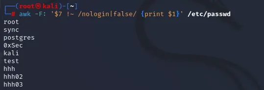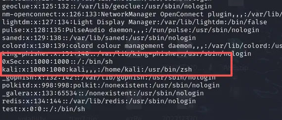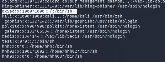 kali:x:1000:1000:...0xSec:x:1000:1000:...两个用户名👉 同一个 UID=1000