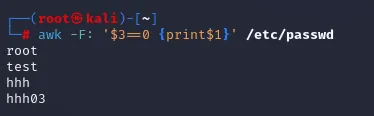 发现除了 root 账户,还有账户:test、hhh、hhh03都有 root 权限,因为只有 root 账户是管理员自己创建的属于正常的,其它账户都不是他创建的属于可疑账户。