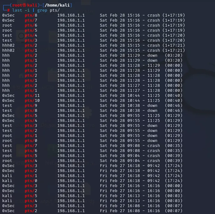 发现在2.28、2.27有root、0xSec、test、hhh02、hhh、test多个可疑用户ssh登录