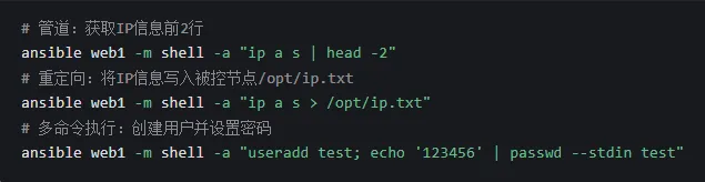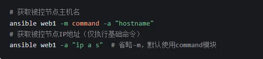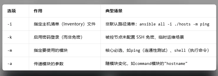 Ansible 通过命令行对远程主机 / 组执行操作,基础语法如下: