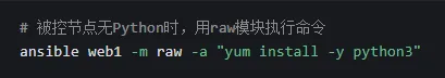 除了上述三个模块,还有raw模块,适用于被控节点未安装 Python 的场景(Ansible 大部分模块依赖 Python):
