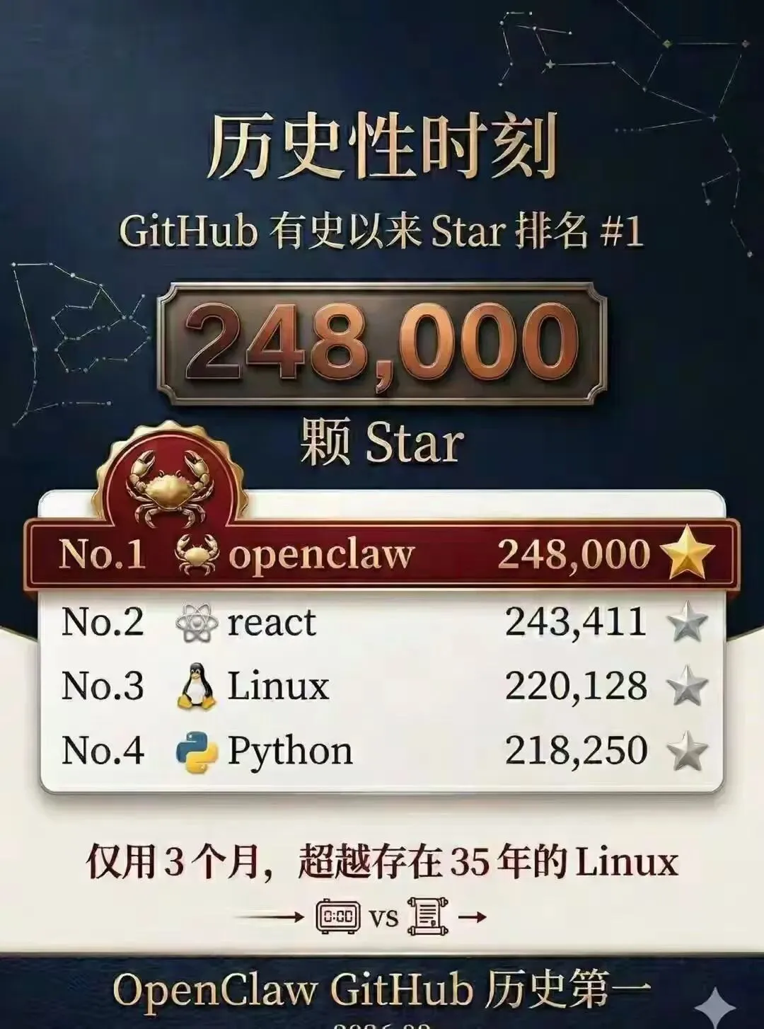 OpenClaw超越Linux,登顶GitHub软件星标历史第一!
