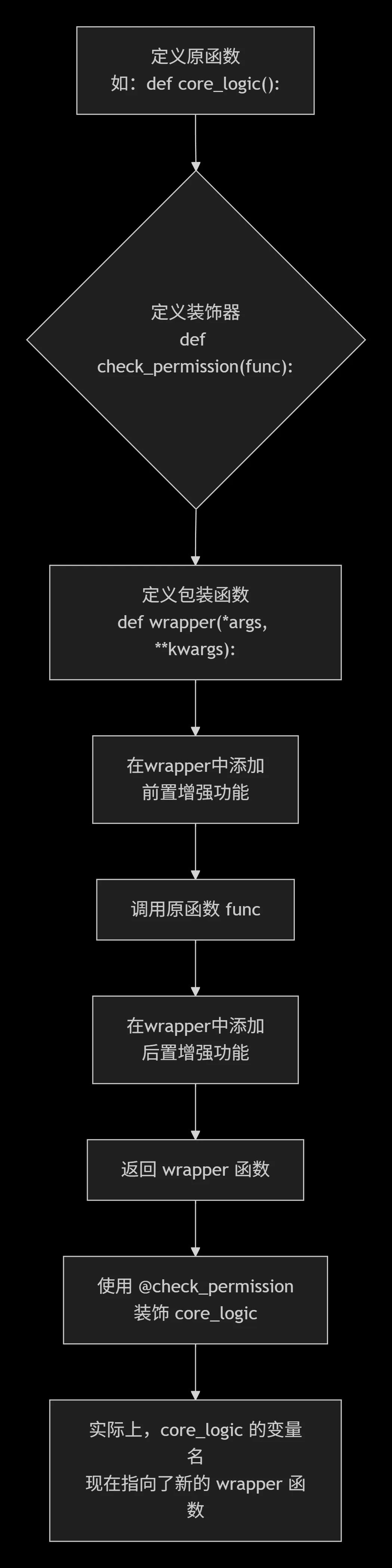 装饰器的核心语法使用 @ 符号,这其实是一种语法糖。它的工作流程可以用下图表示: