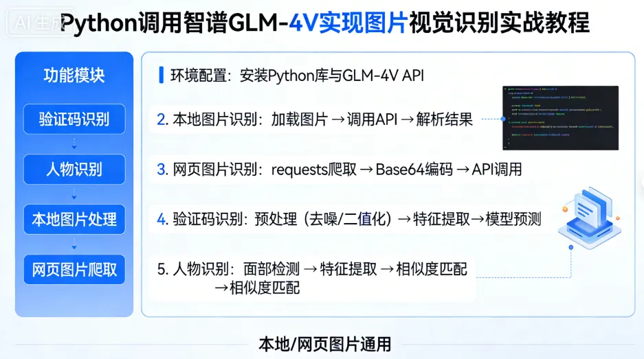 ✅ GLM-4V 调用核心:图片必须转为 Base64 编码传入 API✅ 适配场景:本地图片识别、网页截图识别、验证码解析✅ 核心库:requests(接口调用)、pillow(图片处理)、DrissionPage(网页截图)
